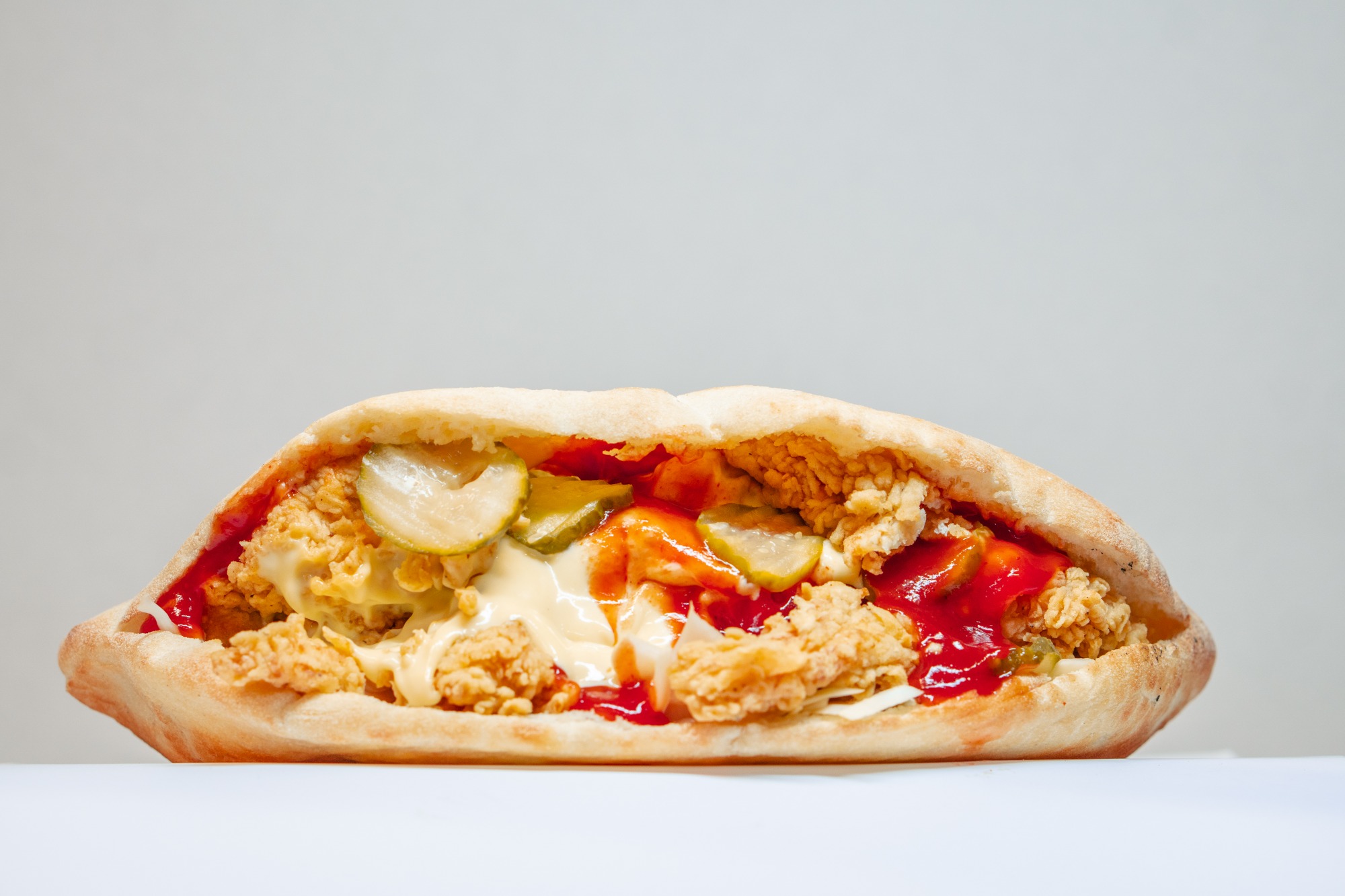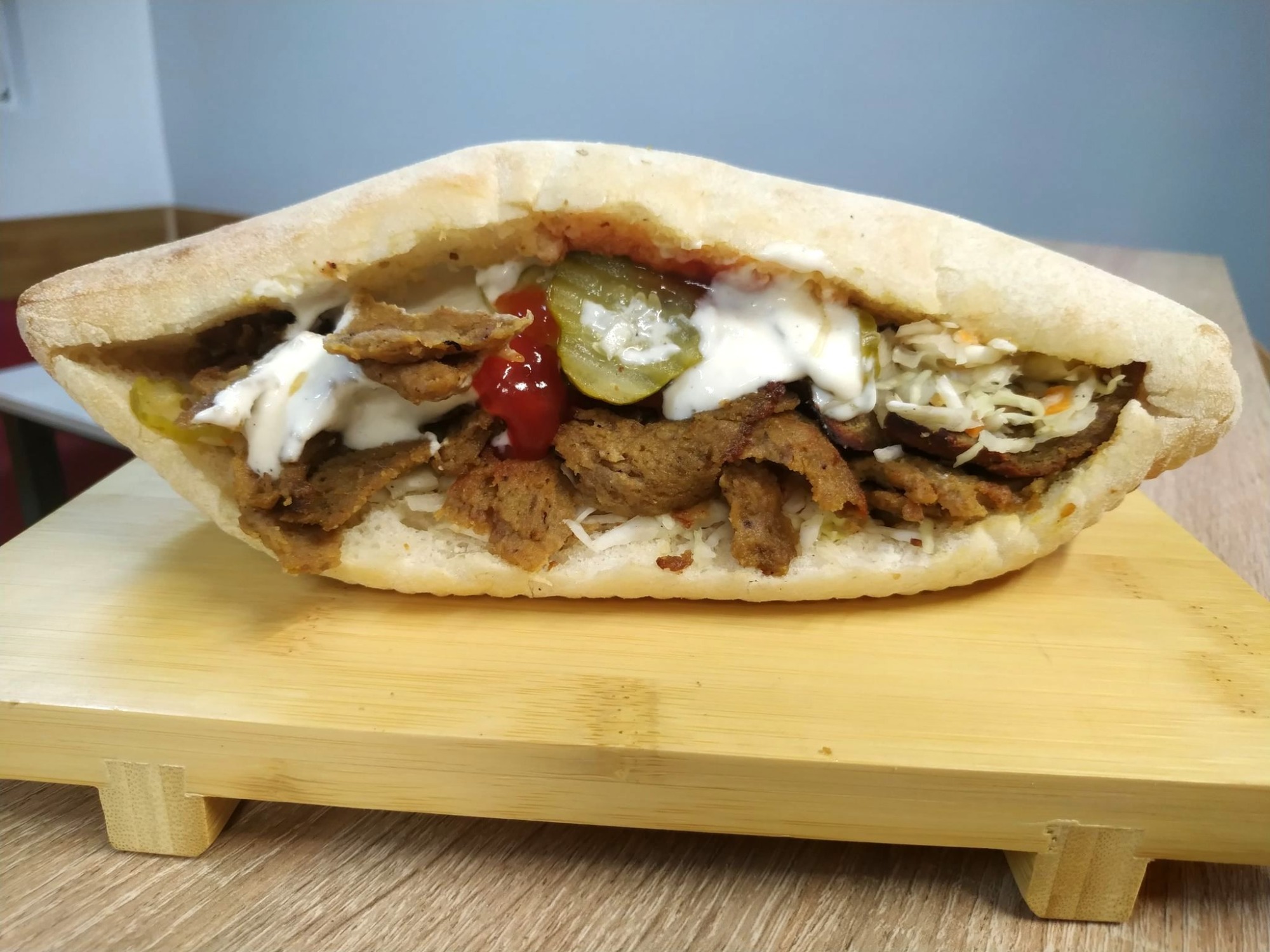 sezamowa bułka wypiekana w lokalnej piekarni, mieszanka wołowiny z drobiem lub kurczak, ser feta, świeże warzywa: pomidor, ogórek, czerwona cebula, oliwki, papryczka jalapeno, surówka z białej kapusty, naturalne przyprawy, sos czosnkowy, ostry, łagodny lub mieszany -