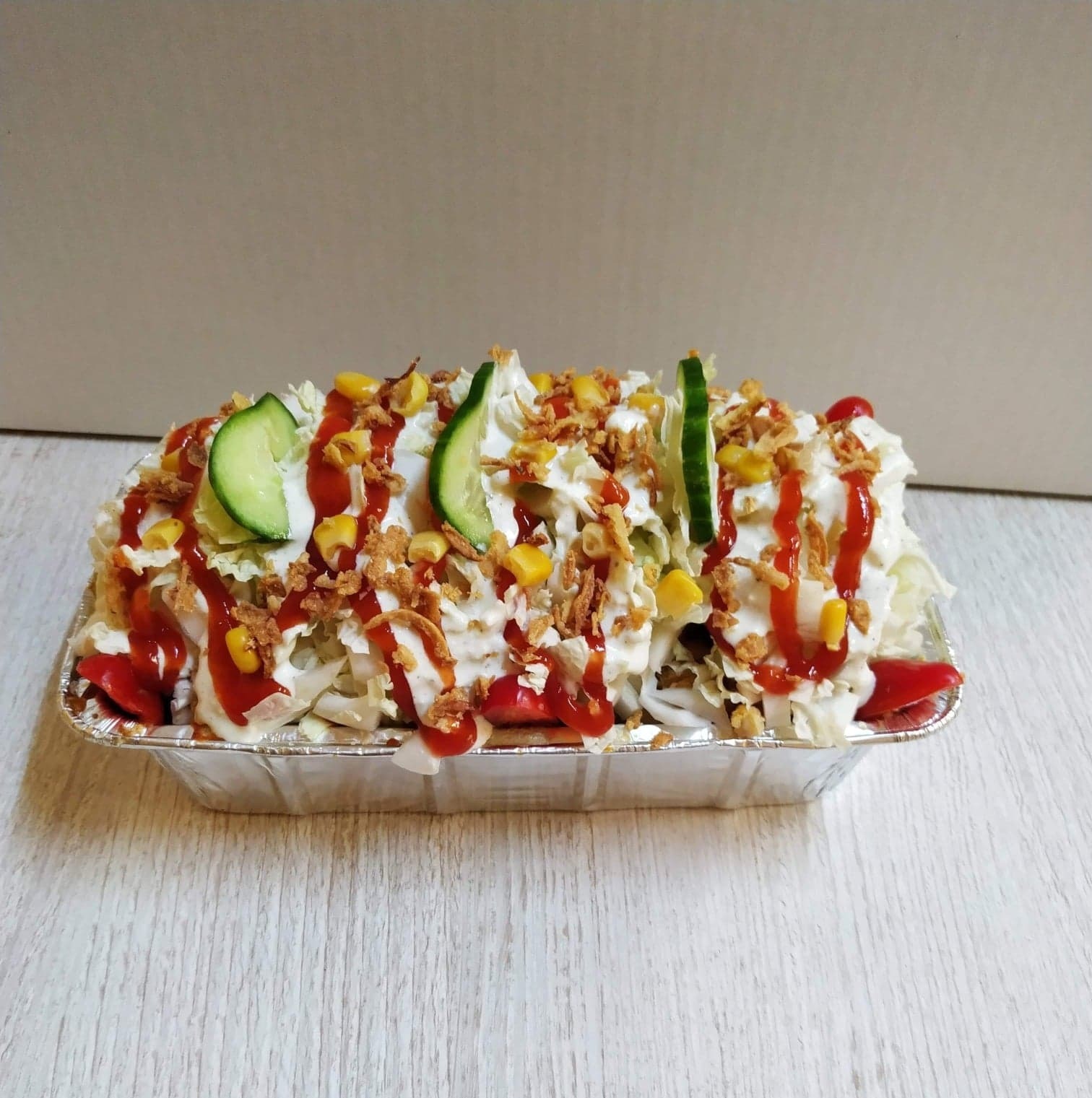 frytki, mieszanka wołowiny z drobiem lub kurczak, ser feta, świeże warzywa: pomidor, ogórek, czerwona cebula, oliwki, papryczka jalapeno, surówka z białej kapusty, naturalne przyprawy, sos czosnkowy, ostry lub łagodny przykryte mieszanką serów, zapiekane w piecu